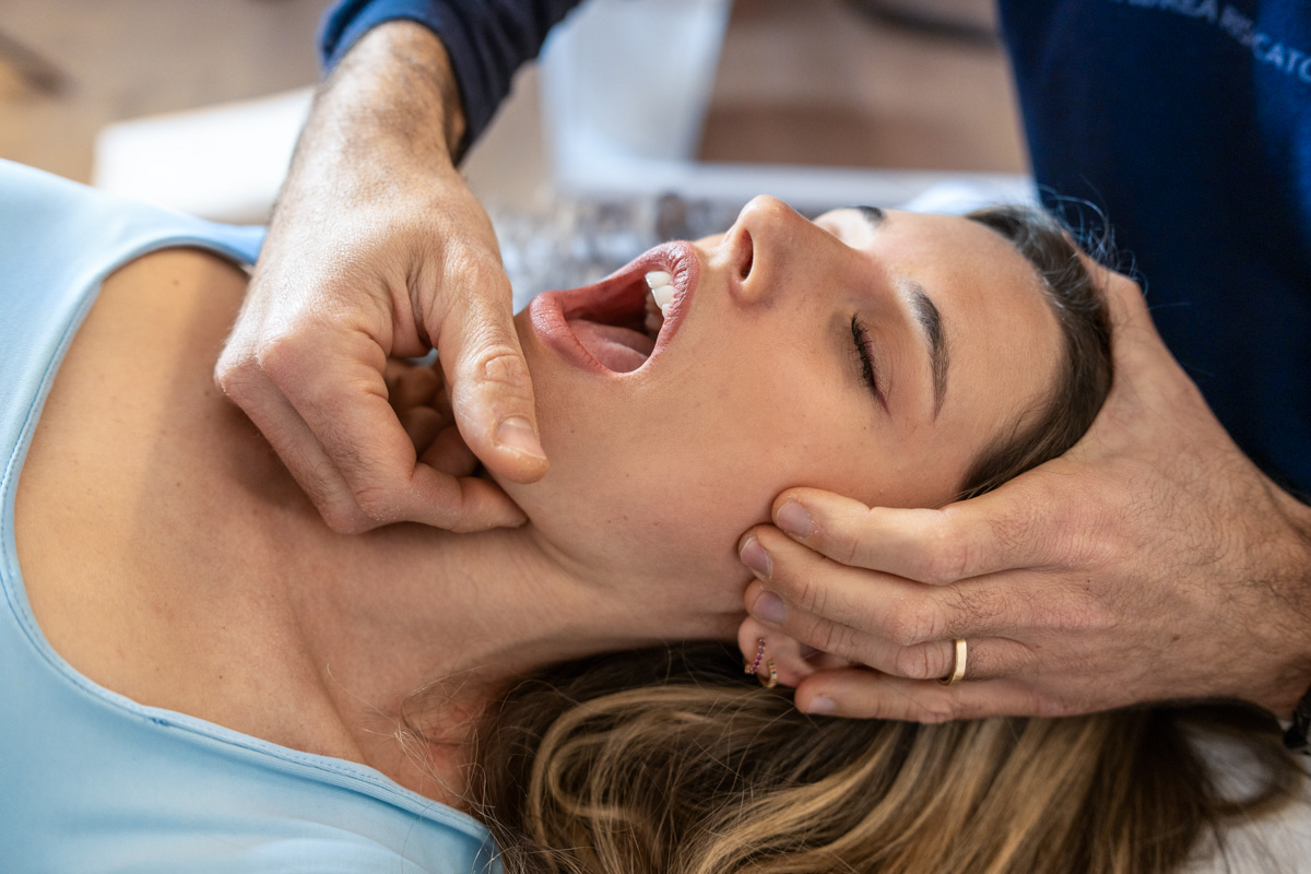 Die ganzheitliche manuelle Therapie zielt auf Kiefergelenksbeschwerden und die damit verbundenen Probleme ab.